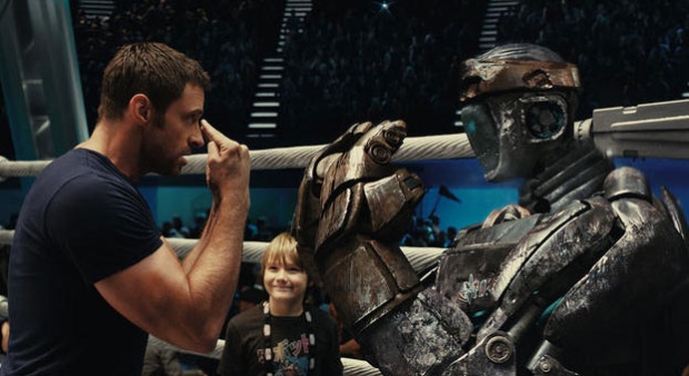 Si, el box es central y el que lleva la acción al espectador, pero es la crisis de Charlie y su hijo Max la que se convierte en el motor que llena de emotividad la película. El guion, a pesar de dar la impresión de estar hecho de pedacitos de otras películas (pasando por Transformes, Robocop vaya hasta momentos de Rocky tenemos por ahí), es ágil y divertido.
