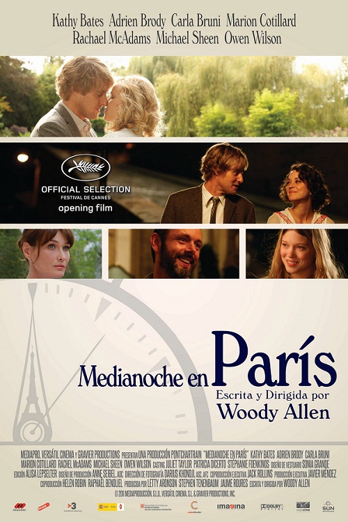 Titulo original: Midnight in Paris/ País: Estados Unidos, España/ Año: 2011/ Director: Woody Allen/ Elenco: Owen Wilson, Rachel McAdams, Marion Cotillard, Kathy Bates, Adrien Brody, Carla Bruni, Michael Sheen/ Guion: Woody Allen/ Música: Stephane Wrembel/ Fotografía: Darius Khondji/ Duración: 94 minutos