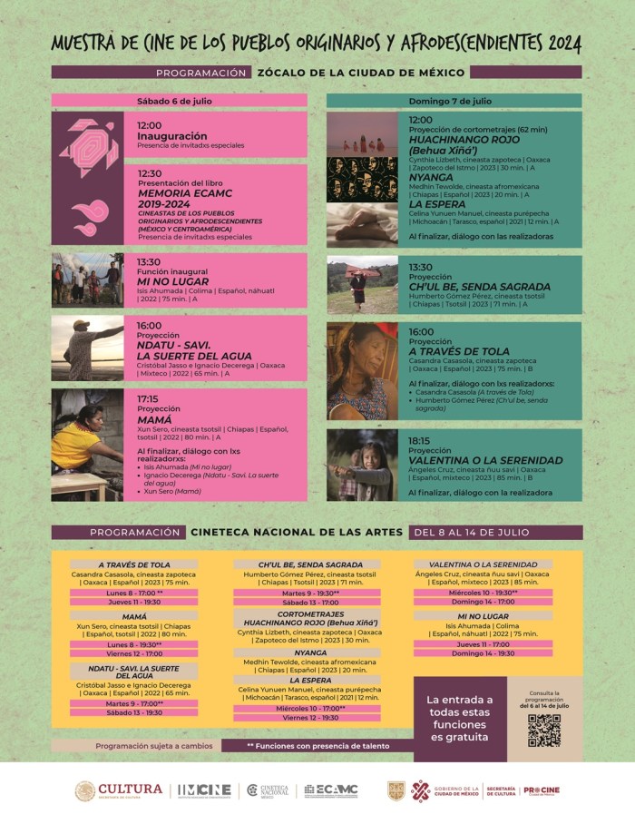 Del 6 al 14 de julio de 2024, el Zócalo de la Ciudad de México y la Cineteca Nacional de las Artes serán las sedes de la Muestra de Cine de los Pueblos Originarios y Afrodescendientes.
