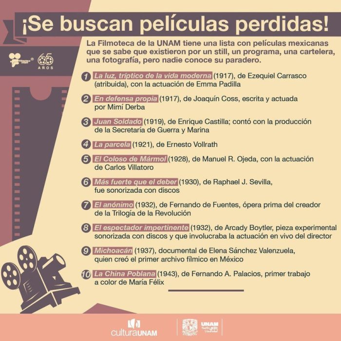 A través de una publicación en las redes sociales de Cultura UNAM, la Filmoteca UNAM ha solicitado la ayuda del público para localizar una decena de películas cuyo paradero ha permanecido como desconocido desde hace tiempo.